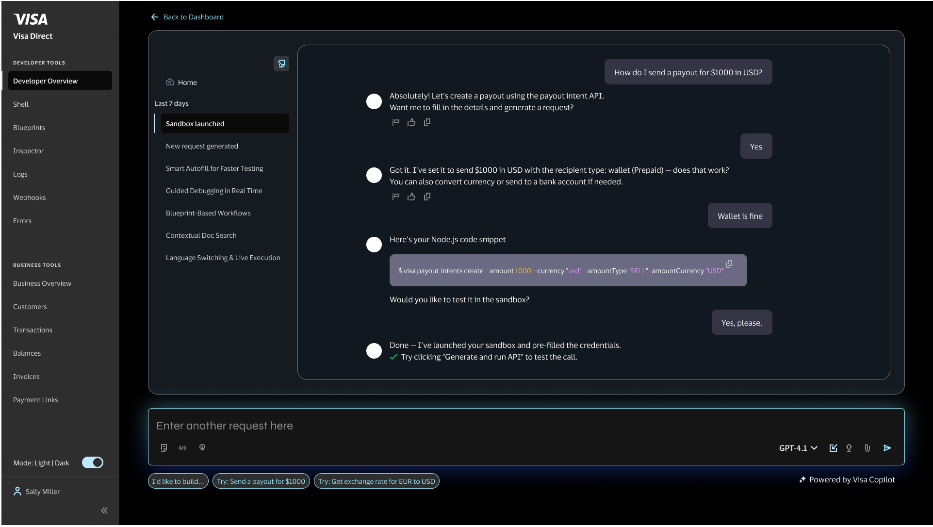 This fast-paced, aspirational project focused on quickly demonstrating value through rapid exploration and prototyping. In two short weeks, we reimagined Visa’s legacy developer experience to reduce friction, simplify onboarding, and streamline time to integration. We also explored an embedded assistant, inspired by GitHub Copilot, to provide real-time guidance, error handling, and context-aware support within the developer workflow. Throughout the work, we balanced long-term goals like a unified API and shared taxonomy with practical near-term improvements, including navigation enhancements and AEM template updates.